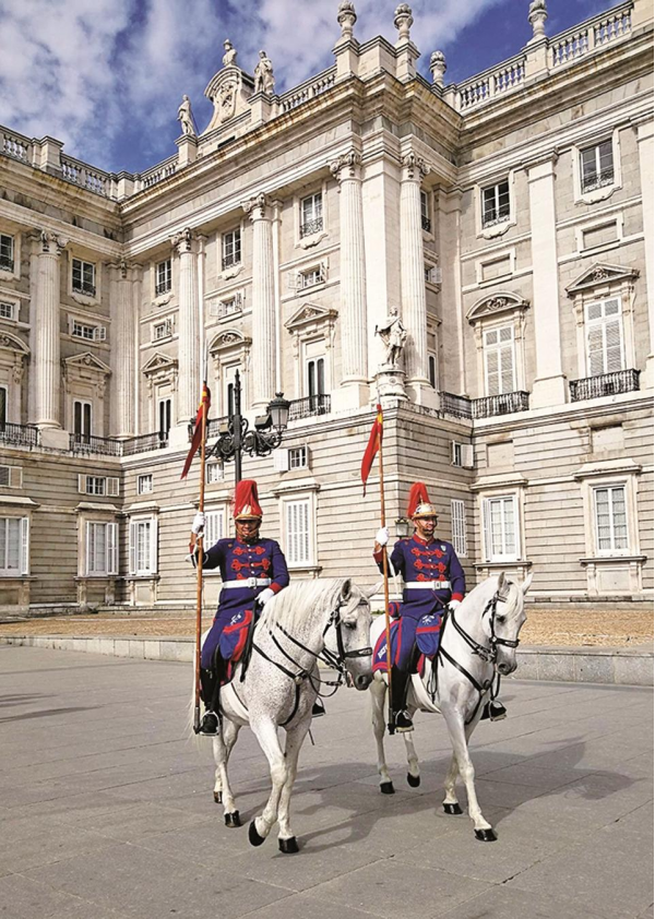 據(jù)導游介紹,西班牙馬德里皇宮建造設計參考了巴黎盧浮宮的草圖,王宮內(nèi)部每個房間都各具特色。皇宮里面藏有不少珍寶級的繪畫、瓷器及其他皇室用品。現(xiàn)在西班牙皇宮已被辟為博物院,雖然皇宮仍然是官方的皇室駐地,但國王并不居住在此,只是偶爾來這里辦公,如果有幸看到皇宮屋頂?shù)膬擅嫫鞄猛瑫r升起,那就表明國王恰好到這里辦公。