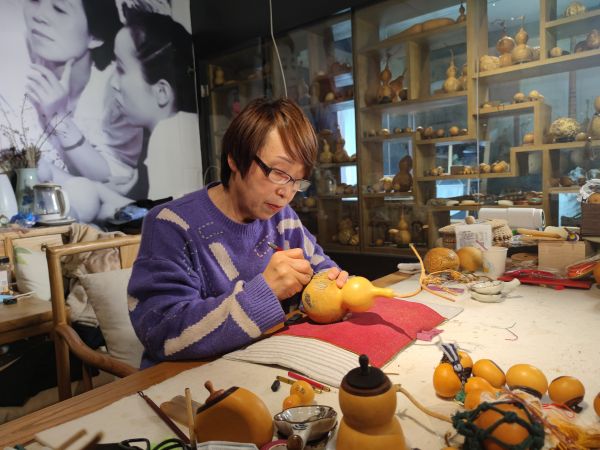 如今,阮琳已將工作重心放在了蘭州刻葫蘆非物質(zhì)文化遺產(chǎn)的保護(hù)和傳播上。她要么參加各種文化方面的交流培訓(xùn)會議,向更多人介紹蘭州刻葫蘆;要么在傳習(xí)所為游客講解刻葫蘆技藝和文化,指點(diǎn)客人自制一件刻葫蘆作品。