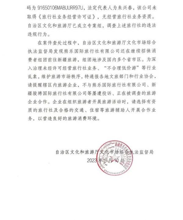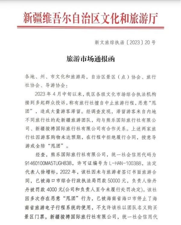 5月11日,新疆維吾爾自治區(qū)文化和旅游廳文化市場(chǎng)綜合執(zhí)法監(jiān)督局發(fā)布通報(bào),熊樂(lè)國(guó)際旅行社有限公司、新疆駿騁國(guó)際旅行社有限公司接待內(nèi)地旅行社赴新疆旅游團(tuán)隊(duì)的過(guò)程中,因游客購(gòu)物未達(dá)預(yù)期,在行程中拒絕履行合同,授意導(dǎo)游或全陪“甩團(tuán)”,已被多次投訴。