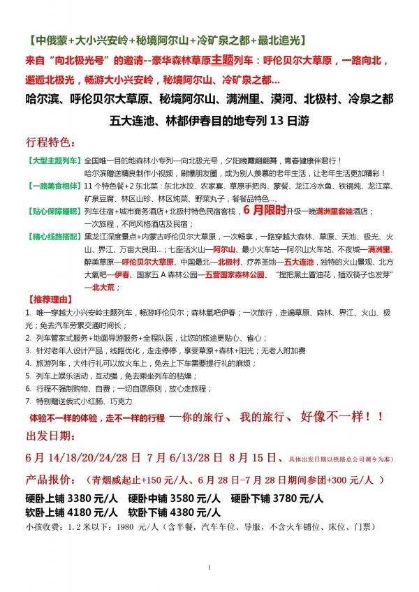 山東向北極光號主題空調(diào)專列13日游 聊城發(fā)團(tuán) 純玩 無購物 哈爾濱 海拉爾 阿爾山 滿洲里 呼倫貝爾 漠河 北極村 五大連池 伊春 ...... 發(fā)團(tuán)時間 20230614 20230620 20230706 20230815 價格 3380 3680 報名電話 0635 8681234