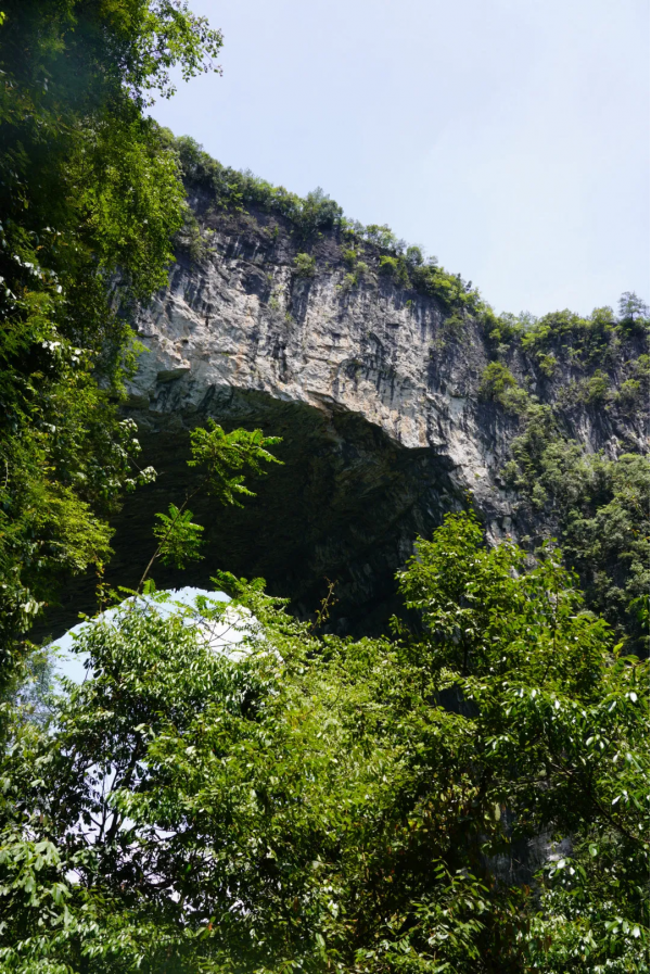 湘西的世外桃源,完全未開發(fā)的徒步路線,臨近之前的一路上還是一片平常的小山村,向下望去時赫然出現(xiàn)一道雄偉的天生橋地貌,與地面落差極高。當?shù)厝酥环Q作天生橋。因其兩邊各有一明洞,橋下還暗藏一個黑洞,由上往下的角度俯瞰極像豬鼻,于是命名“”豬鼻嶺“。