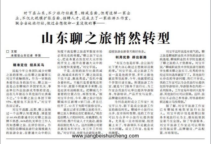 劉寶平這樣說是有底氣的。聊之旅是聊城職業(yè)技術學院的旅游實踐基地,聊城職業(yè)技術學院也就成了聊之旅的人才資源庫。劉寶平說:“聊城職業(yè)技術學院旅游方面的學生都來聊之旅實習,優(yōu)秀的學生經(jīng)過雙向選擇就留下了。其他旅行社存在的導游問題,我們不存在。我的工作室可以為會員旅行社提供包括導游培訓、導游服務在內(nèi)的一系列服務。工作室每年培訓大批導游,其他旅行社可以借調(diào)。這樣,旅行社不必自己養(yǎng)導游,用導游的時候還能立馬找得到。”