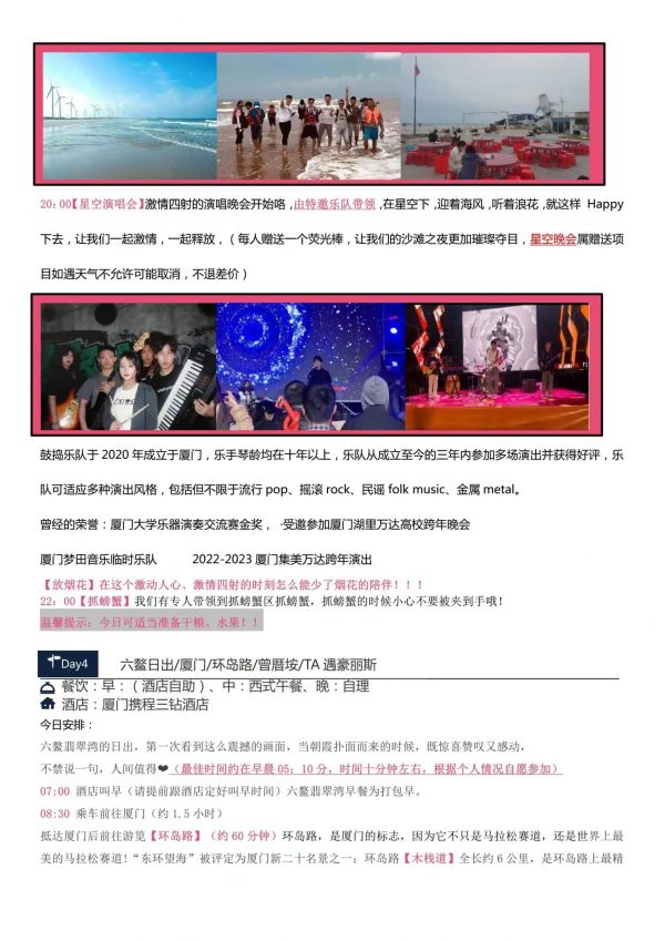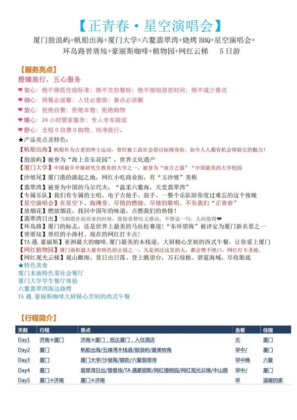 廈門-星空演出雙飛5日游 聊城發(fā)團 純玩 無購物 廈門鼓浪嶼 帆船出海廈門大學 星空演唱會六鰲翡翠灣 環(huán)島路曾厝垵 科技館 八市網紅植物園 ...... 發(fā)團時間 20230621-20230625 20230628-20230702 價格 4190 報名電話 0635 8681234