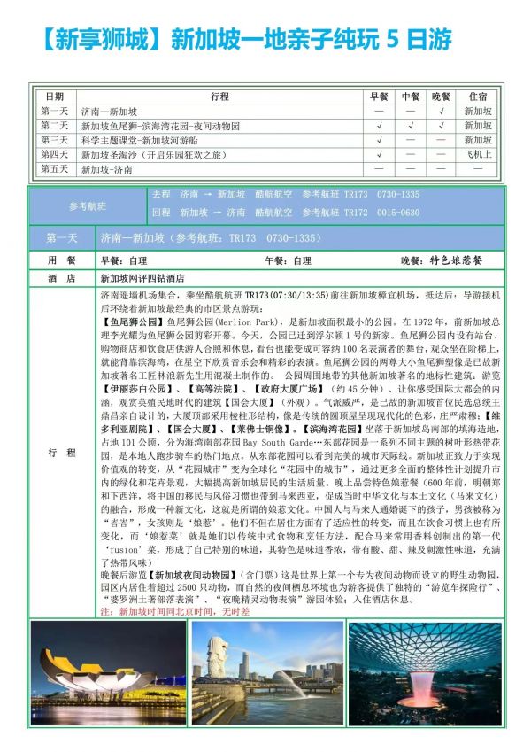 新加坡獅城雙飛5日游 聊城發(fā)團 純玩 無購物 新加坡夜間動物園 圣淘沙環(huán)球影城 圣淘沙糖果屋 ...... 發(fā)團時間 20230710 20230717 20230724 20230807 20230821 價格 8999 報名電話 0635 8681234