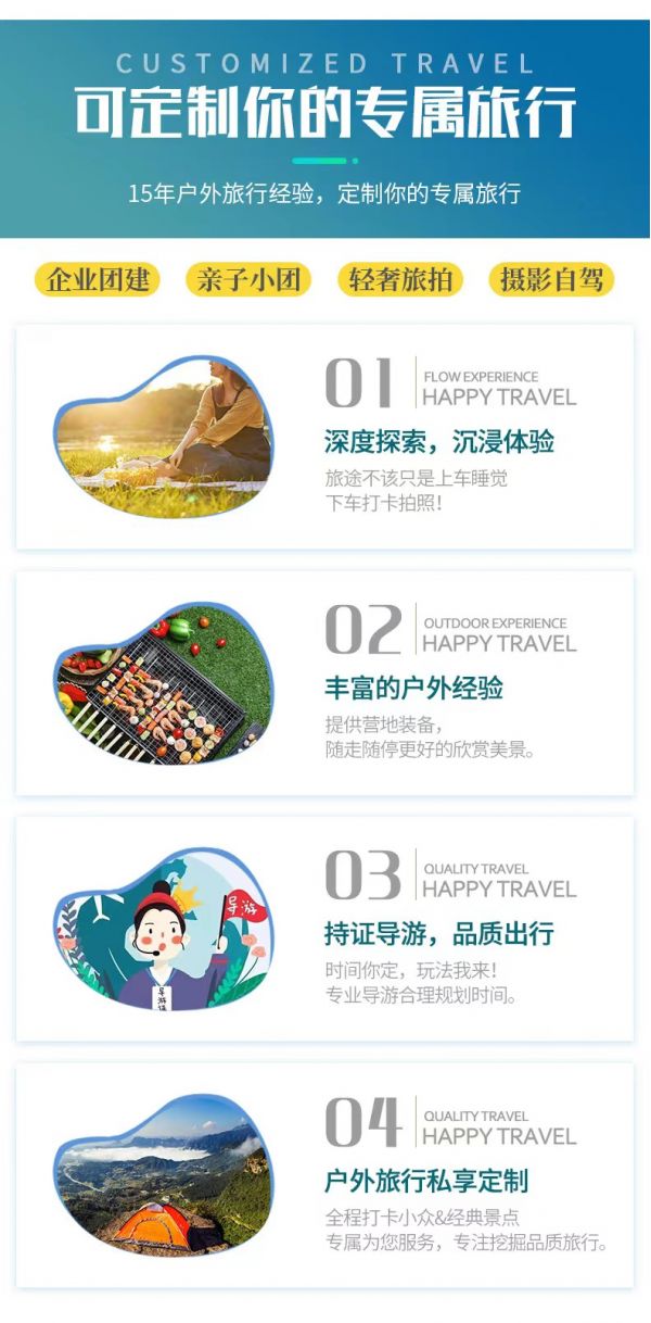 私人訂制:我們業(yè)務范圍囊括了全國各大城市,川西、西北、西藏、新疆,在路上永遠有我們的身影。我們將為每一個有定制需求的你策劃出獨屬于自己的完美旅行。