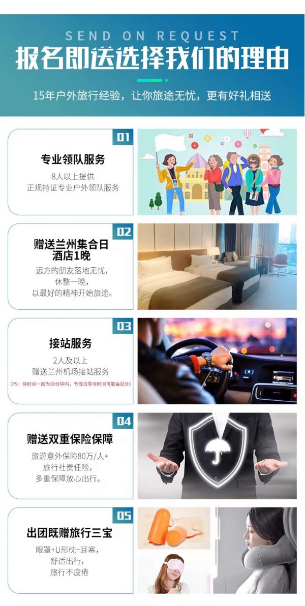接站服務:2人及以上免費提供蘭州市區(qū)拼車接火車服務,接火車的工作人員會在您出發(fā)日期前一天21:30之前向您推送消息并與您聯(lián)系,如果超過時間沒有接到任何通知,請及時與領隊或報名處聯(lián)系。(節(jié)假日用車人數(shù)較多情況下客人等待時間可能會延長;我方會安排臨近航班拼車接站,如遇其他客人航班火車延誤晚點情況,等待時間可能會延長,敬請諒解)