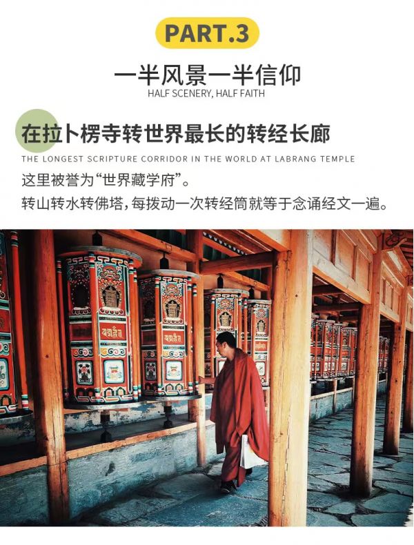 繼續(xù)往前【拉卜楞寺】,有“世界佛學院”之稱的【拉卜楞寺】。拉卜楞寺是藏傳佛教格魯派六大宗主寺之一 , 規(guī)模僅次于布達拉宮,是藏傳佛教格魯派最高佛學學府之一,被世界譽為“世界藏學府”,相當于我們眼中的“清華北大”。在漫長的發(fā)展中拉卜楞寺形成了獨特的藏傳佛教文化,包括建筑、學院、法會、佛教藝術、藏經(jīng)等,曾經(jīng)是甘、青、川毗鄰地區(qū)藏族的政治、宗教、文化中心。在學院堪布的帶領下來,進入寺院,欣賞美麗的壁畫、唐卡,精美佛像;走過朱紅玄黃長廊,和喇嘛一起撥動轉經(jīng)筒;在這紅白相間的宏偉寺院中,看虔誠的信徒磕著等身長頭來此轉經(jīng);與僧人一起聽經(jīng)、打坐,靜靜感受這份信仰的力量。而后經(jīng)過【瑪曲】,母親河黃河這里自西南入境,復從西北出境。