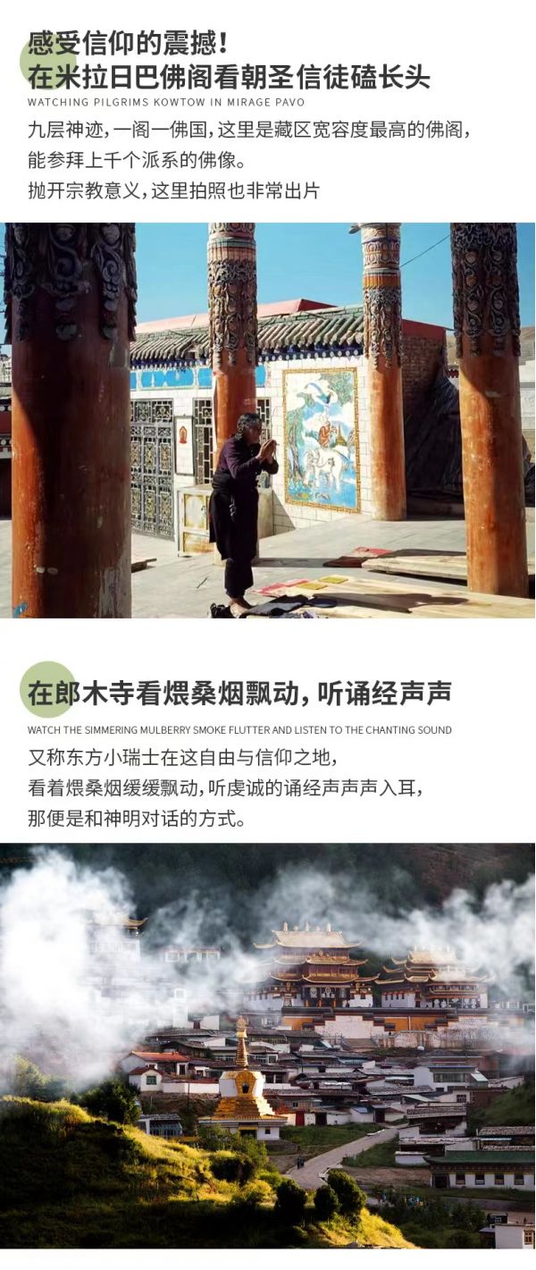 而后前往米拉日巴佛閣。甘南擁有最密集、最豐富的藏傳佛教寺廟,【米拉日巴佛閣】便是其中最著名的代表作,被稱為“九層神跡”。米拉日巴佛閣是藏傳佛教噶舉派(白教)在安多藏區(qū)的代表寺院,閣內(nèi)主要供奉藏傳佛教史上最富傳奇色彩、婦孺皆知的米拉日巴尊者,他同時也是噶舉派創(chuàng)教者之一。米拉日巴佛閣樓高共九層,有以金剛為主的四密乘的眾多佛像、菩薩、護法神等各類佛像1720尊,還有規(guī)模巨大的反映藏傳佛教內(nèi)容的各類壁畫,繪畫技法高超,具有很高的藝術價值。在這里聽聽米拉日巴尊者的傳奇故事,了解藏傳佛教各個教派的歷史,在僧人呢喃佛音中感受那份信仰的虔誠。