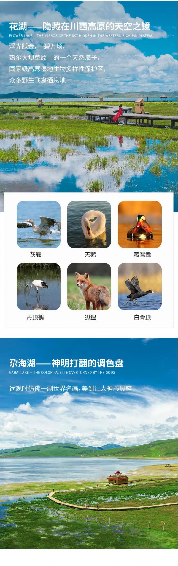 然后我們前往草原湖泊【花湖】。在僅次于呼倫貝爾草原的熱爾大壩草原之上,有一個絕美的天然海子---花湖。花湖濕地屬于國家級高寒濕地生物多樣性保護區(qū),是眾多野生飛禽的主要棲息地,如灰雁、白骨頂、天鵝、黑頸鶴、丹頂鶴、藏鴛鴦、狐貍等。花湖的夏天和秋天別有一番風味。夏天,號稱“天空之境”的花湖,周邊開滿野花,美輪美奐。秋天,廣闊的草原變成一片金黃,藍色的花湖被包圍其中,仿佛金色地毯上的一顆藍寶石。湖邊建有木質(zhì)棧道,一直延伸到水中,可以沿著棧道走到濕地深處,沿途都可以找到拍大片的好角度。