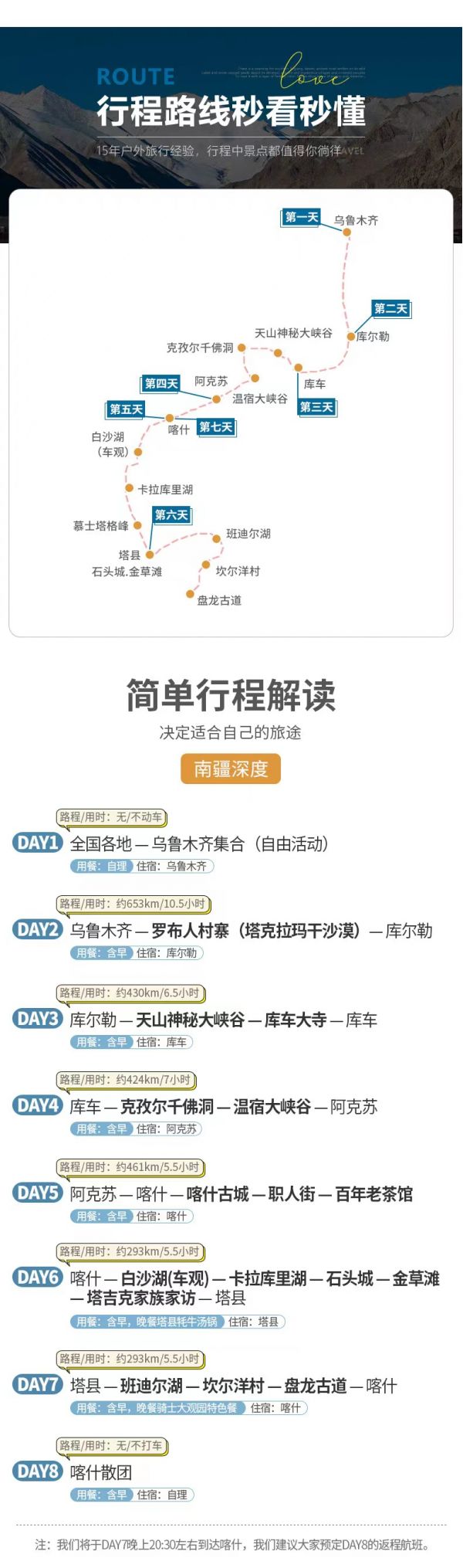 當(dāng)天車程較長(zhǎng),從北疆穿越天山甘溝進(jìn)入南疆腹地,氣候變化較大,請(qǐng)適當(dāng)增減衣物,注意補(bǔ)充水分。可提前購(gòu)買一些零食,以備不時(shí)之需。