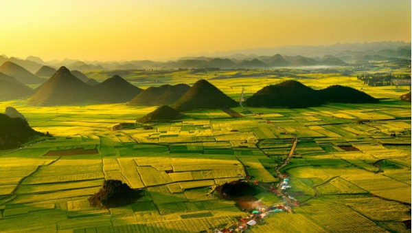羅平是全國(guó)有名的油菜籽生產(chǎn)基地,氣候溫和,雨量充沛,年降雨量1700毫米,十分利于油菜生產(chǎn)。陽(yáng)春二月,30萬(wàn)畝油菜花把羅平的大地裝點(diǎn)得一片金黃,羅平壩子里15萬(wàn)畝油菜形成了一個(gè)大花園,遼闊無(wú)邊。舉目四望,那一望無(wú)際的花海中時(shí)有錐狀峰叢,在無(wú)垠的花海中聳起,連綿起伏,變化萬(wàn)千,花姿、花影、花浪、花潮使人陶醉。油菜花的奇觀,點(diǎn)綴著富饒美麗、多姿多彩的迤東大地。