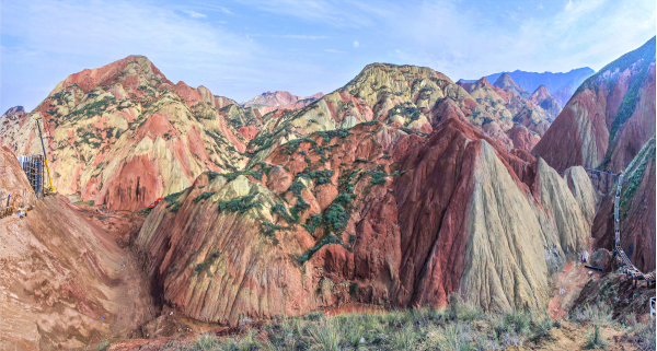 翠峰瀾天觀景平臺(tái)位于丹霞道中部,其具有觀光、休憩功能,此處為丹霞地貌的一個(gè)分水嶺,可以看到兩種不同的場(chǎng)景,左側(cè)山頭翠綠的碧色與右側(cè)彩色的山丘形成鮮明的對(duì)比。