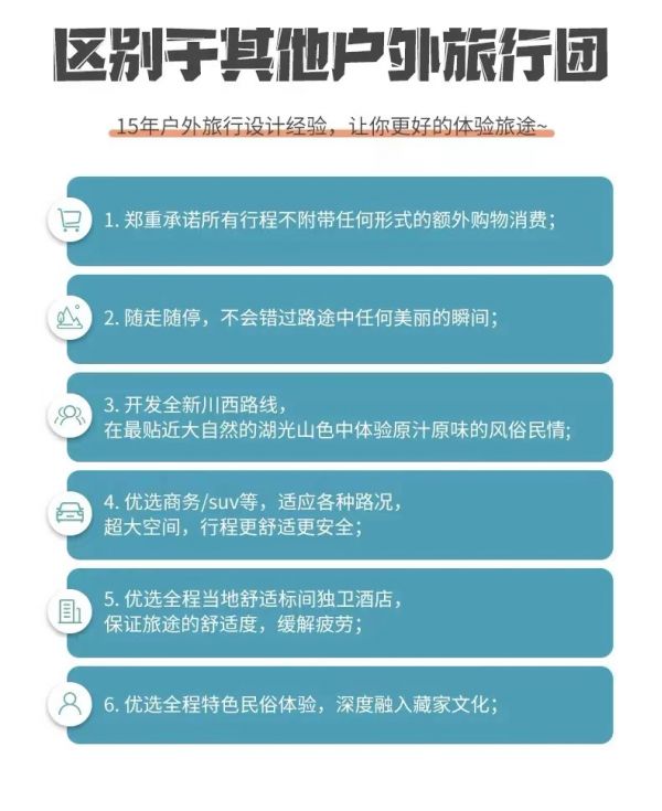 3、沿途景區(qū)景點(diǎn)、餐廳、廁所、加水點(diǎn)、高原緩沖區(qū)內(nèi)設(shè)有小賣部、超市、旅游紀(jì)念品、手工藝土特產(chǎn)等販賣攤點(diǎn),非我方安排,請(qǐng)游客根據(jù)自身需求及興趣選擇消費(fèi),并保留好購(gòu)物小票以便后續(xù)維權(quán);購(gòu)物時(shí)請(qǐng)保管好隨身攜帶的物品,不到人多、擁擠的地方購(gòu)物,不當(dāng)眾清點(diǎn)錢包里的鈔票,也不隨商品推銷人員到偏僻地方購(gòu)物或取物。