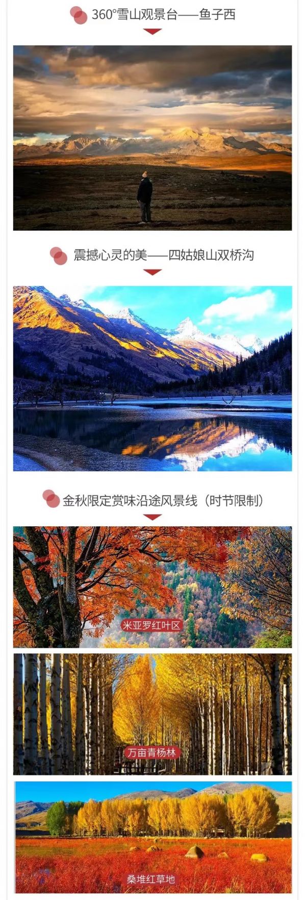 早餐后前往甲居三號(hào)觀景臺(tái)晨拍,之后告別晨曦中的丹巴甲居藏寨,前往四姑娘山雙橋溝景區(qū)游玩(門票80元/人,觀光車70元/人,必須乘坐,費(fèi)用自理),景區(qū)開闊平坦、景點(diǎn)集中,全程通車。雖已開發(fā),但環(huán)境維護(hù)的出于意料的好,景區(qū)內(nèi)各種服務(wù)包括指示也十分清晰明了,隊(duì)員們可以更加舒適、方便的游覽整個(gè)景區(qū)。由于整條溝海拔落差達(dá)到一千多米,所以地貌比較豐富,風(fēng)景也完全值得期待。給人遠(yuǎn)離塵世的感悟。游玩盡興后出溝繼續(xù)啟程,而后翻越巴朗山,觀看植物從常綠闊葉林到高山荒漠的垂直變化,感受“一山觀四季、十里不同天”的氣象變遷。沿臥龍峽谷,欣賞峽谷小橋、流水、枯藤、老樹的美麗風(fēng)光抵達(dá)映秀,感受2008年汶川大地震“地動(dòng)山搖、山崩地裂、滄海桑田”后的景象,感悟大自然的力量;之后沿都汶高速返回成都統(tǒng)一散團(tuán)(由車上游客協(xié)商一致送至統(tǒng)一散團(tuán)點(diǎn),若協(xié)商不成則由司機(jī)送至三環(huán)內(nèi)就近地鐵站散團(tuán)),結(jié)束本次愉快的旅行。由于川西地區(qū)路況復(fù)雜,山道狹窄,有可能因?yàn)槎萝嚩l(fā)生延誤,請(qǐng)大家盡量預(yù)定第二天返程的航班或車次。