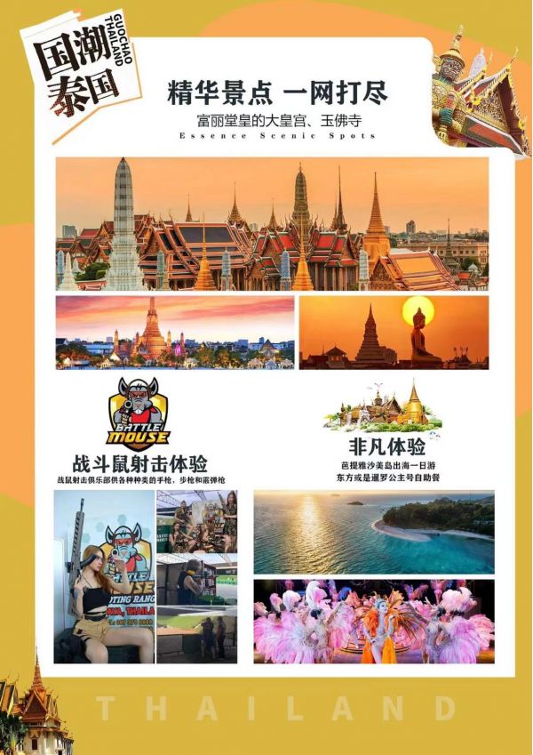 酒店早餐后前往參觀【珠寶展覽中心】 (約 180 分鐘) 此有各式各樣的紅寶石《代表愛情及幸福,象征 著熱情、仁愛、威嚴》、藍寶石《代表貴族,象征著慈愛、誠實、德望》以及黃寶石《代表招財, 象征著健康、長壽》,可以在這里選擇到適合自己喜愛的寶石。泰國被公認為是世界上首屈一指的 寶石及珠寶中心之一,經 ISO-9001:2000品質認證。【戰(zhàn)斗鼠射擊】戰(zhàn)鼠射擊俱樂部位于芭提雅,占地20萊,是一個室內射擊館, 擁有IDPA及IPSC訓練資質。館內各項設施齊全,整個區(qū)域都安裝有空調,設有專門的人休閑放松區(qū)域。 戰(zhàn)鼠射擊俱樂部供各種種類的手槍,步槍和霰彈槍,包括:Smith&Wesson 686和1522,Glock 9mm,Colt Gold Cup 45或CZ 455。子彈規(guī)格范圍有.22LR,.38ACP,.9MM,.45 ACP等規(guī)格。暹羅爽泰莊園【騎大象】坐在象背上起起伏伏,穿梭在熱帶雨林中,您仿佛進入了一個天然大氧吧,靜下心來還能聆聽到叢林深處的幽幽鳥啼和潺潺溪流聲,可別忘了和憨態(tài)可掬的大象合影留念。【熱帶水果園】果園占地面積有幾百畝大,里面栽種著各五花八門的熱帶水果,有葡萄、山竹、榴蓮、紅毛丹、椰青和火龍果等。味道鮮美的水果任您品嘗,還可以享受回歸大自然的樂趣。【東方公主號或暹羅公主號】聞名遐邇的并不是暹羅灣夜景,而是東方公主們 的美麗。泰國人妖的精湛歌舞表演令很多人對臺上的麗人們雌雄難辨,在船上我們將與她們近距離接觸。為您端菜、 與您共舞的都是盛裝美麗的人妖公主,在此提醒大家,若被人妖“騷擾”,最好定氣凝神、泰然處之。
