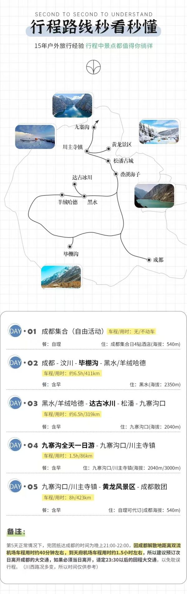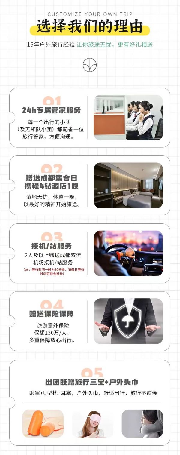 (1)受天氣、堵車等客觀因素影響,當(dāng)日回成都比較晚,請(qǐng)盡量不預(yù)訂當(dāng)天的返程機(jī)票或火車票,以免因?yàn)槎萝嚱o您帶來沒有必要的損失。