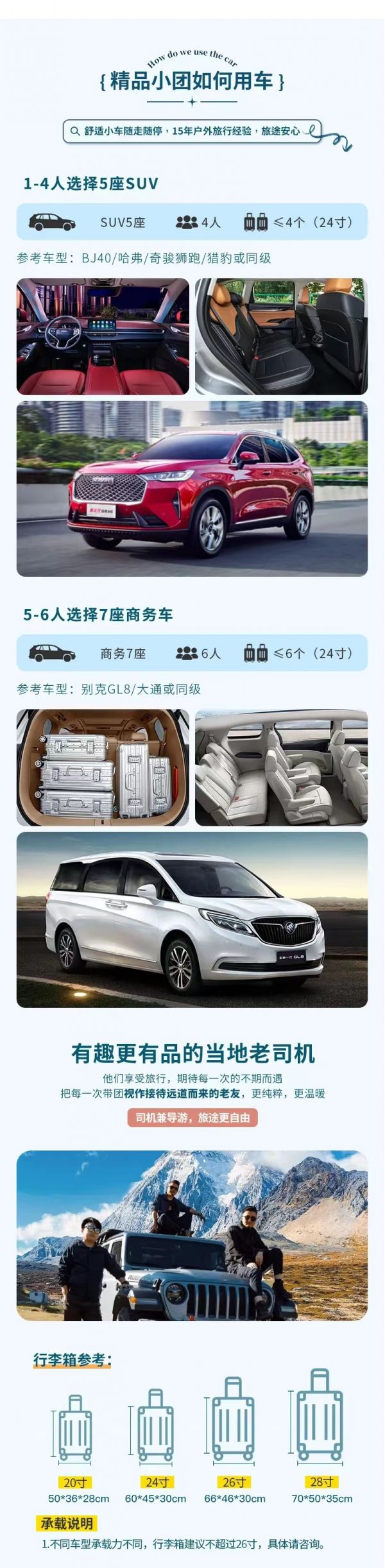 交通:2-6人VIP私享小團,全程舒適商務(wù)車出行,車型大小根據(jù)實際人數(shù)安排,保證一人一正座位,且由駕駛經(jīng)驗豐富的司機為您的出行保駕護航,報價包含車費、油費、停車費、維修費及司機勞務(wù)費。住宿:行程所列6晚住宿。我們會提供行程內(nèi)展示照片的酒店或其他條件相似酒店,但因沿途條件有限,如酒店設(shè)施達不到您的期望,請您諒解。