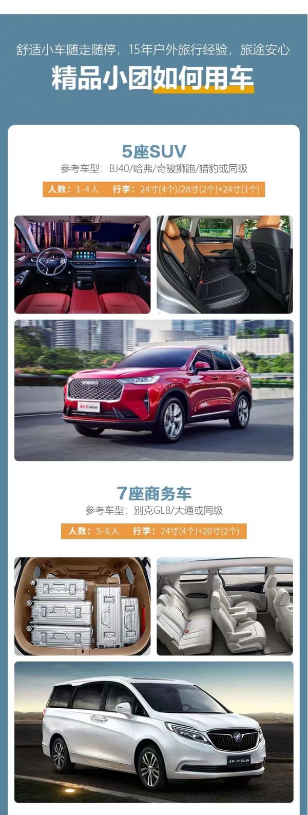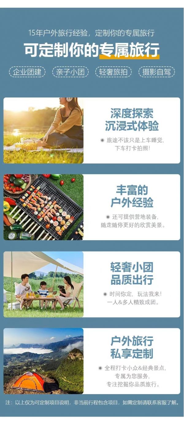 私人訂制:我們業(yè)務(wù)范圍囊括了全國各大城市,川西、西北、新疆、西藏,在路上永遠有我們的身影。我們將為每一個有定制需求的你策劃出獨屬于自己的完美旅行。