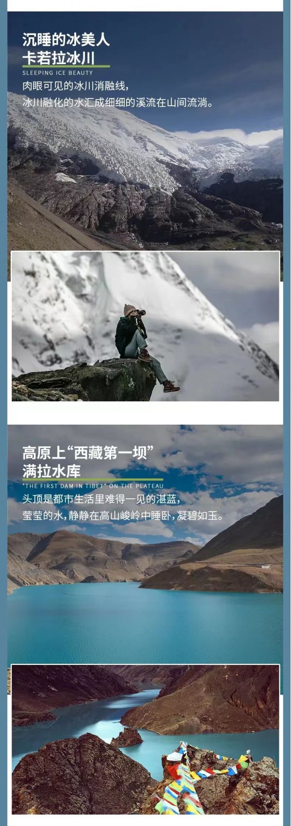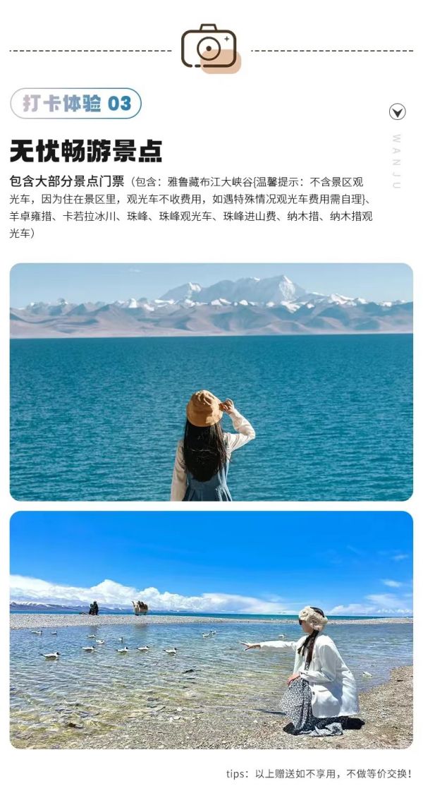 門票:包含雅魯藏布江大峽谷{溫馨提示:不含景區(qū)觀光車,因為住在景區(qū)里,觀光車不收費用,如遇特殊情況觀光車費用需自理}、羊卓雍措、卡若拉冰川、珠峰大本營門票、珠峰觀光車、珠峰進山費、納木措、納木措觀光車。