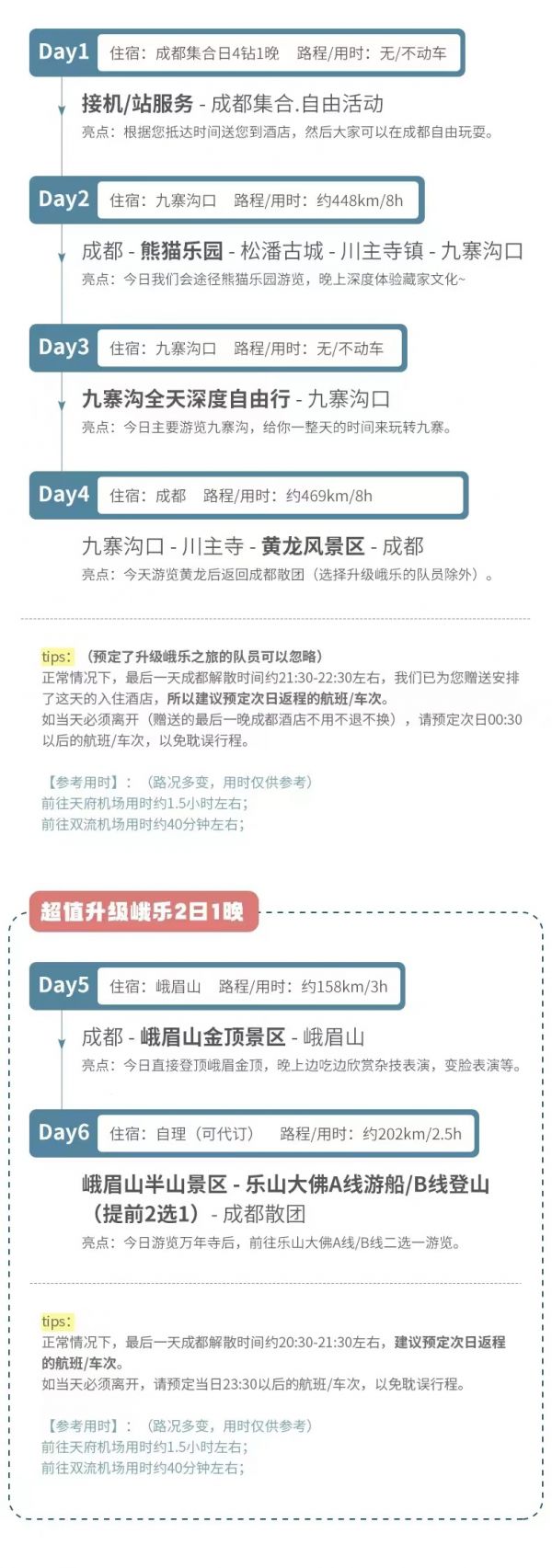 成都市區(qū)統(tǒng)一集合點(diǎn)出發(fā)(節(jié)假日或旺季接人/出發(fā)時(shí)間會提前約30分鐘,敬請理解)。