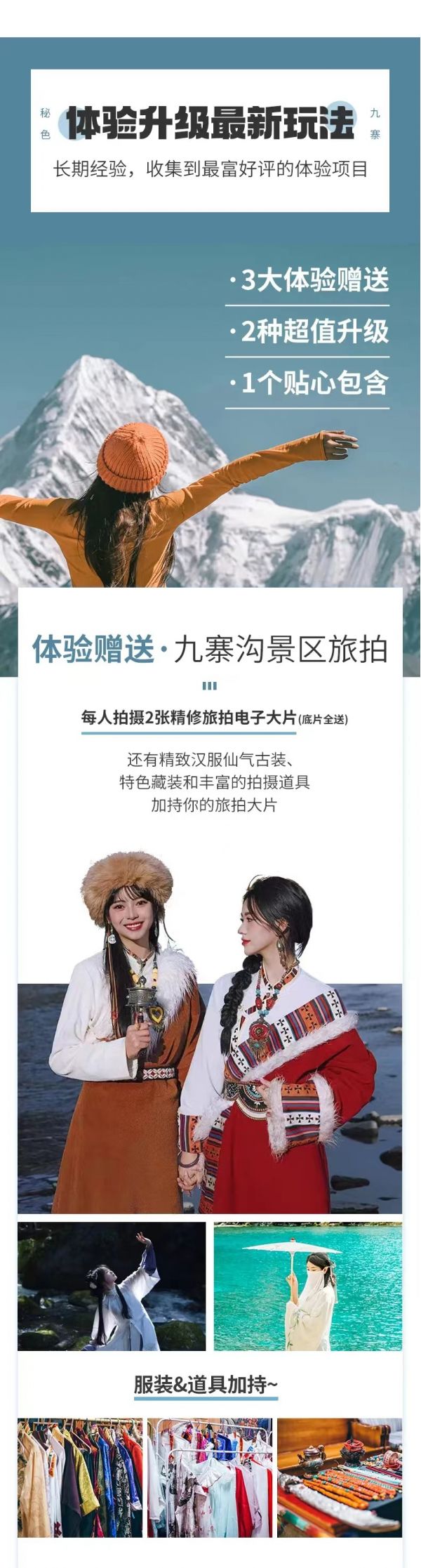 隨著季節(jié)的變化,九寨溝也呈現(xiàn)出不一樣的風(fēng)姿;深秋的九寨溝享譽(yù)世界,只見漸次經(jīng)霜的彩林深淺相間、錯(cuò)落有致,是“萬山紅遍,層林盡染”的最佳寫照,在漫山遍野濃烈的紅襯托之下,碧水更綠、藍(lán)天更藍(lán),呈現(xiàn)出光怪陸離的水景;待入冬,莽莽林海都覆上皚皚白雪,林海雪原似玉樹瓊花,潔白、高雅,是觀賞九寨六絕之“藍(lán)冰”和“雪峰”的最好時(shí)機(jī)。也因這不二的美,這里也是許多熱門影視劇里的取景場地,今天我們就在這個(gè)大小熒屏收錄過的仙境來一場旅拍,由專業(yè)駐地?cái)z影師為大家拍攝漢服/藏裝旅拍大片,每人2張精修電子照、底片全送,定格住旅程最美的瞬間。
