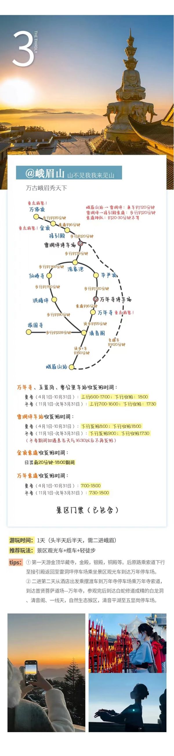 【金頂】,游金頂華藏寺,金殿,銀殿,銅殿,大型觀景臺等,觀世界最高佛教朝拜中心,登攝身崖,俯視川西平原的優(yōu)美風(fēng)光,充分感受峨眉“雄,秀,奇,險(xiǎn),幽”的五大特色。然后原路乘索道下行至接引殿返回至雷洞坪停車場乘坐景區(qū)觀光車到達(dá)萬年停車場。