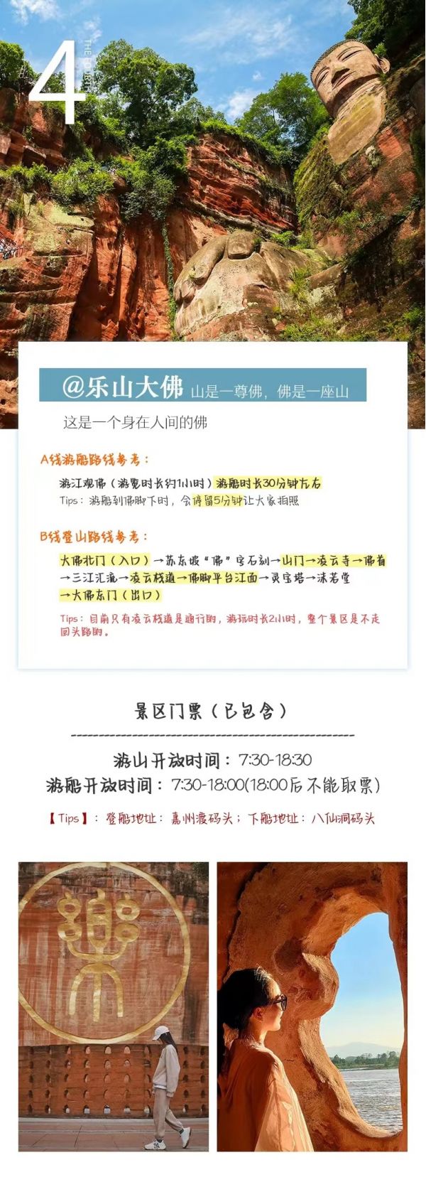 用午餐,品嘗世界非物質(zhì)文化遺產(chǎn)-翹腳牛肉或峨眉地道九大碗(根據(jù)實(shí)際情況2選1安排),步行約15分鐘至迎春橋,乘坐旅游車來到樂山。深度登山游覽樂山大佛景區(qū)(參觀約3小時(shí))步行333個(gè)臺階到達(dá)山頂,觀賞世界第一大彌勒坐佛-樂山大佛、凌云寺、九曲摘道、大雄寶殿、靈寶塔,在瞻仰樂山大佛宏偉氣勢的同時(shí),體驗(yàn)”蜀道難、難于上青天的感覺”,抱千年佛腳后,游漫山的石刻佛像、凌云寺、靈寶塔從東門下山返回到停車場。也可以選擇樂山大佛游船活動哦~看樂山大佛湖面全景。
