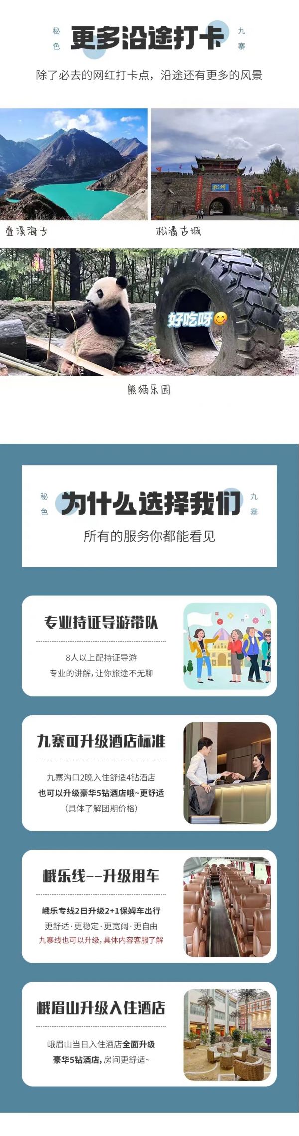 (2)九寨溝面積較大游客需求不一,因此主要以游客自助游形式游覽,如無領(lǐng)隊(duì)陪同望您諒解。游覽開始前領(lǐng)隊(duì)會與您約定好集合時(shí)間,請務(wù)必按時(shí)到達(dá)指定地點(diǎn),避免耽誤大家接下來的行程;