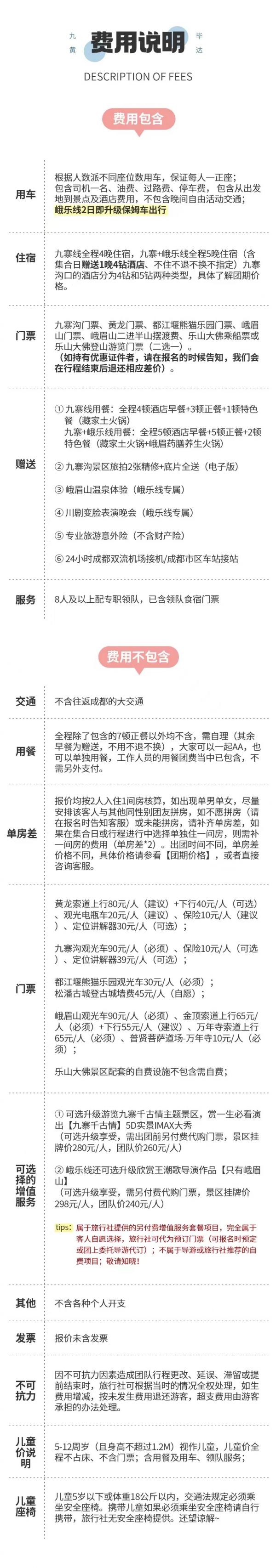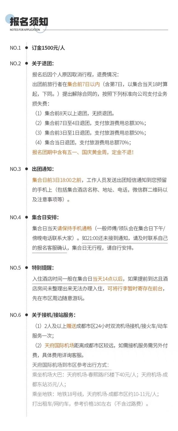 3、當(dāng)天返回成都時(shí)間約在下午的21:30左右,由于不能預(yù)估有可能堵車等不可抗力因素情況,建議客人不要預(yù)定當(dāng)天返程的火車或是飛機(jī),以免因?yàn)槎萝嚱o您帶來沒有必要的損失。若因自行預(yù)定當(dāng)天大交通造成延誤的,我社不賠償任何費(fèi)用,不承擔(dān)任何責(zé)任!敬請知曉。