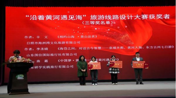 會上,對山東省“沿著黃河遇見海”旅游線路產品設計大賽獲獎者予以證書和現(xiàn)金獎勵。