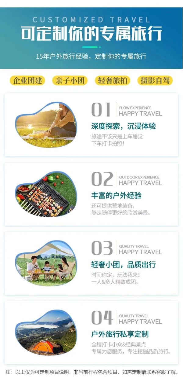 私人訂制:我們業(yè)務(wù)范圍囊括了全國各大城市,川西、西北、西藏、新疆,在路上永遠有我們的身影。我們將為每一個有定制需求的你策劃出獨屬于自己的完美旅行。