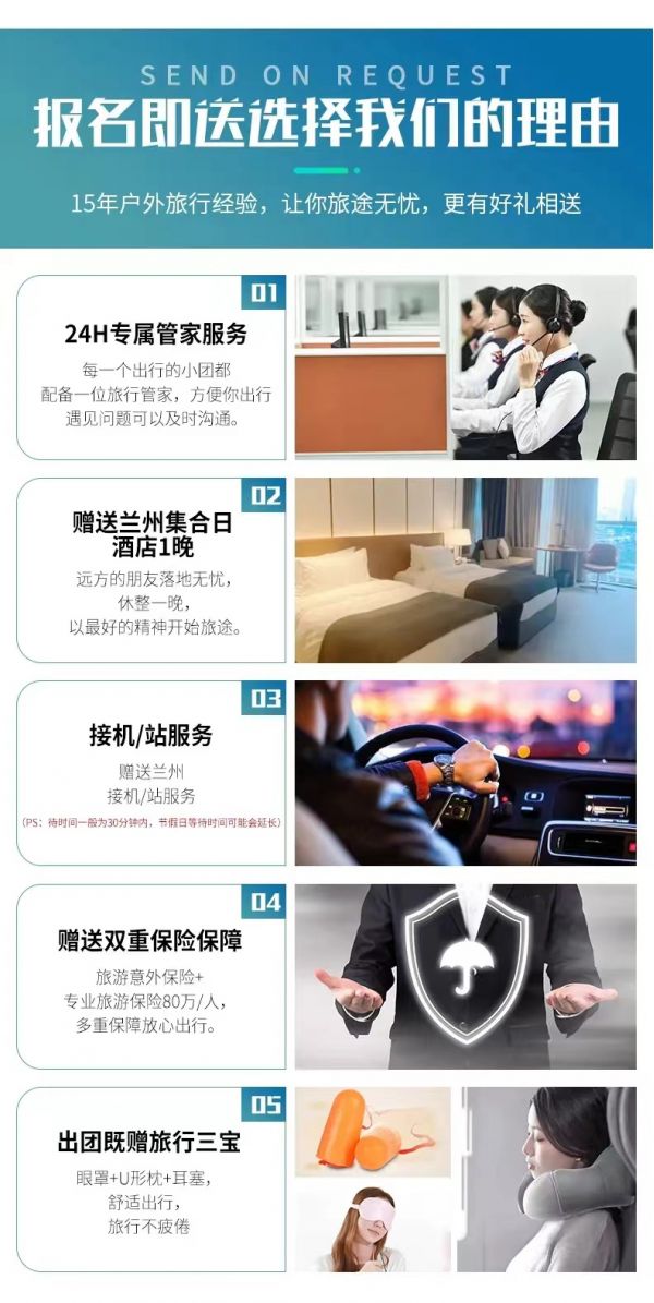 接站服務(wù):2人及以上免費提供蘭州市區(qū)拼車接火車服務(wù),接火車的工作人員會在您出發(fā)日期前一天21:30之前向您推送消息并與您聯(lián)系,如果超過時間沒有接到任何通知,請及時與領(lǐng)隊或報名處聯(lián)系。(節(jié)假日用車人數(shù)較多情況下客人等待時間可能會延長;我方會安排臨近航班拼車接站,如遇其他客人航班火車延誤晚點情況,等待時間可能會延長,敬請諒解)
