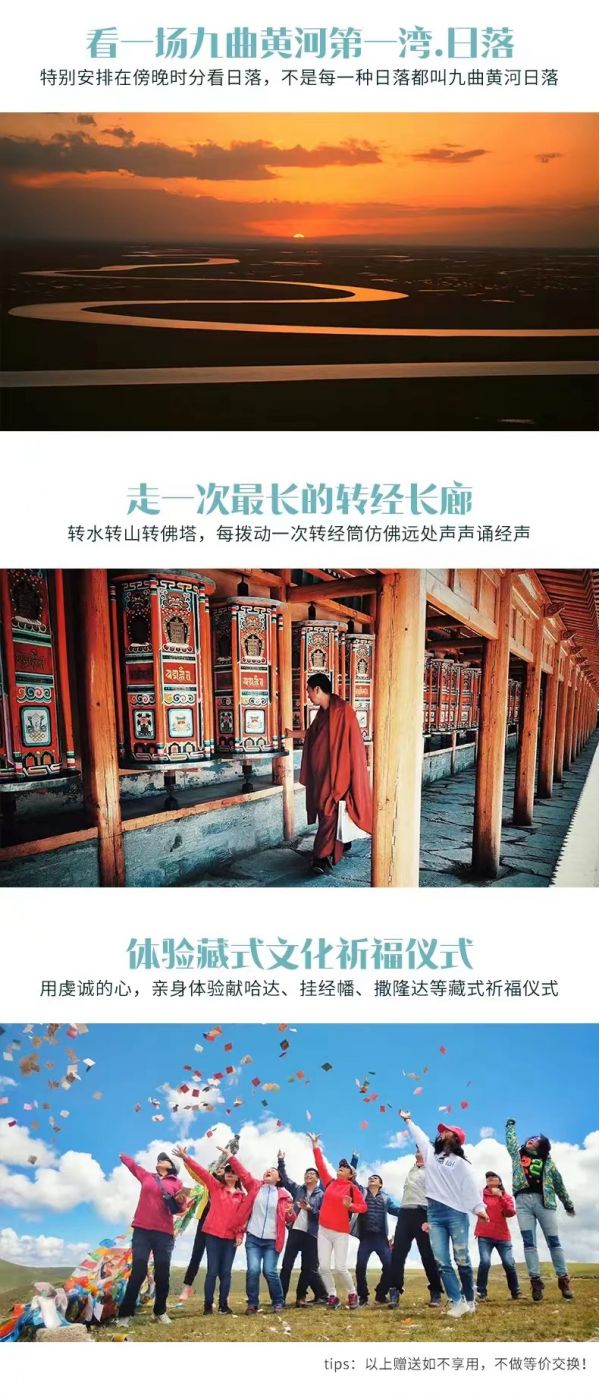 繼續(xù)往前【拉卜楞寺】,有“世界佛學(xué)院”之稱的【拉卜楞寺】。拉卜楞寺是藏傳佛教格魯派六大宗主寺之一 , 規(guī)模僅次于布達拉宮,是藏傳佛教格魯派最高佛學(xué)學(xué)府之一,被世界譽為“世界藏學(xué)府”,相當于我們眼中的“清華北大”。在漫長的發(fā)展中拉卜楞寺形成了獨特的藏傳佛教文化,包括建筑、學(xué)院、法會、佛教藝術(shù)、藏經(jīng)等,曾經(jīng)是甘、青、川毗鄰地區(qū)藏族的政治、宗教、文化中心。在學(xué)院堪布的帶領(lǐng)下來,進入寺院,欣賞美麗的壁畫、唐卡,精美佛像;走過朱紅玄黃長廊,和喇嘛一起撥動轉(zhuǎn)經(jīng)筒;在這紅白相間的宏偉寺院中,看虔誠的信徒磕著等身長頭來此轉(zhuǎn)經(jīng);與僧人一起聽經(jīng)、打坐,靜靜感受這份信仰的力量。而后經(jīng)過【瑪曲】,母親河黃河這里自西南入境,復(fù)從西北出境。
