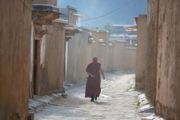 接著我們整裝出行前往【郎木寺】。郎木寺是一座風情小鎮(zhèn),在四川和甘肅兩省的交界處,周圍被草原、樹林、山丘、紅色的石崖圍繞,環(huán)境優(yōu)美,是許多信教徒心中的朝圣圣地。一條小溪從鎮(zhèn)中流過,雖寬不足2米,名“白龍江”。溪北是甘肅的“賽赤寺”,南岸屬四川若爾蓋縣的格爾底寺,中間夾著回族的清真寺,兩個藏傳佛教的寺廟在這里隔江相望。一條小溪融合了藏、回兩個和平共處的民族,喇嘛寺院、清真寺各據(jù)一方地存在著,你有你的曬大佛,我有我的做禮拜,小溪兩邊的人們各自用不同的方式傳達著對信仰的執(zhí)著。