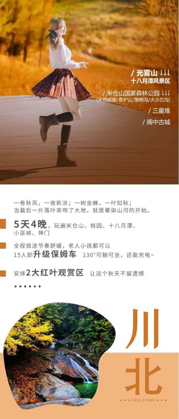 早餐后出發(fā),經(jīng)成巴高速抵達(dá)位于川東北的巴中【光霧山】,光霧山被譽(yù)為“中國(guó)紅葉第一山”,因常年云霧繚繞而得名,每年10月~11月是觀賞光霧山紅葉的最佳時(shí)機(jī)。【十八月潭】是藏在光霧山深處的動(dòng)人篇章,曾有人說(shuō):十八月潭是川東北的“九寨溝”,瀑布似九寨,紅葉絕天下。在長(zhǎng)約3.5公里的珍珠溝內(nèi),密布著18個(gè)恍若神造仙成的瀑潭,每個(gè)潭形似月桂,基本上有一相映的瀑布,謂之“十八月潭”。大小水潭似顆顆珍珠綴成的長(zhǎng)長(zhǎng)珠鏈,沿溝飛瀉的瀑流如粒粒珍珠鋪就的幅幅珠簾。漫步其間,潭水相連,時(shí)而穿過(guò)大片彩林,一瀉千里,時(shí)而一片靜謐,明凈幽藍(lán)。登高俯瞰,滿目流金瀉玉、彩虹波動(dòng),尤如串串珍珠藏于溝壑溪澗。步入十八月潭,如在畫中游,讓你陶醉得駐足不前。看過(guò)秋景后前往光霧山鎮(zhèn)入住。