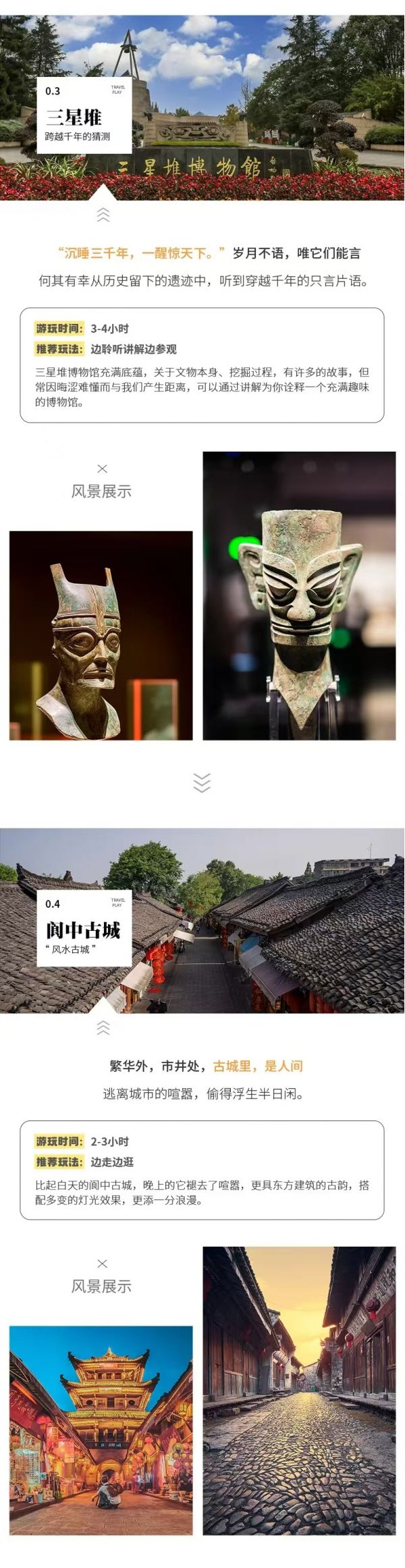 早晨從成都酒店出發(fā),大家相互認(rèn)識(shí),相互熟悉,一路歡歌笑語(yǔ),充滿期待。隨后抵達(dá)【三星堆博物館】開始參觀,三星堆古遺址距今已有3000至5000年歷史,是迄今在西南地區(qū)發(fā)現(xiàn)的范圍最大、延續(xù)時(shí)間最長(zhǎng)、文化內(nèi)涵最豐富的古城、古國(guó)、古蜀文化遺址。在這批古蜀秘寶中,有許多光怪陸離奇異詭譎的青銅造型,有高2.62米的【青銅大立人】、有寬1.38米的【青銅面具】、更有高達(dá)3.95米的【青銅神樹】等,均堪稱獨(dú)一無(wú)二的曠世神品。而以流光溢彩的金杖為代表的金器,以滿飾圖案的邊璋為代表的玉石器,亦多屬前所未見的稀世之珍。游覽后繼續(xù)出發(fā),下午抵達(dá)【閬中古城】,古城山圍四面,水繞三方,有著2300多年的歷史,與安徽黃山的徽州古城、山西平遙的平遙古城和云南麗江的麗江古城并稱為中國(guó)四大古城,如果說(shuō)麗江古城是風(fēng)花雪月,那么閬中古城便是人間煙火,古城里時(shí)不時(shí)飄出的陣陣醋香更是久久縈繞在心頭,古城所蘊(yùn)含的三國(guó)文化、春節(jié)文化、科舉文化更是值得深入探究。晚上我們?nèi)胱」懦侵苓叄绕鸢滋斓拈佒泄懦牵砩系乃嗜チ诵鷩蹋邧|方建筑的古韻,搭配多變的燈光效果,更添一分浪漫。