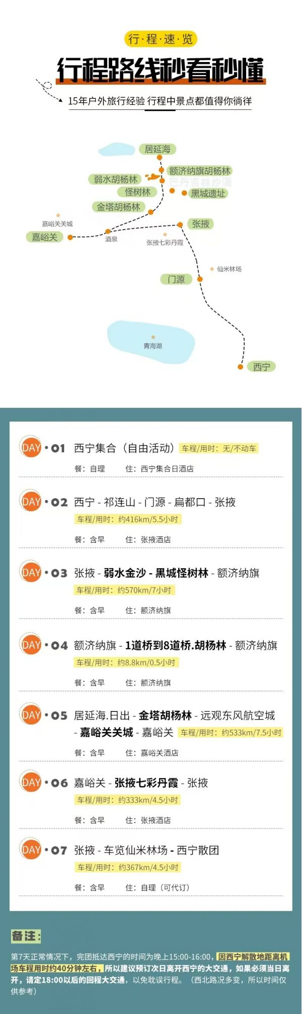 備注請(qǐng)對(duì)應(yīng)使用我方額濟(jì)納7日行程,因使用其它行程造成的投訴,責(zé)任自負(fù);請(qǐng)仔細(xì)閱讀以上行程文檔,同意并保證遵守我方安排,以免為您帶來不必要的麻煩;如產(chǎn)生合同糾紛或人身意外事故,按《中華人民共和國合同法》、《道路交通法》、《保險(xiǎn)賠償條例》裁定;本行程作為旅游合同附頁與旅游合同同等法律效力。