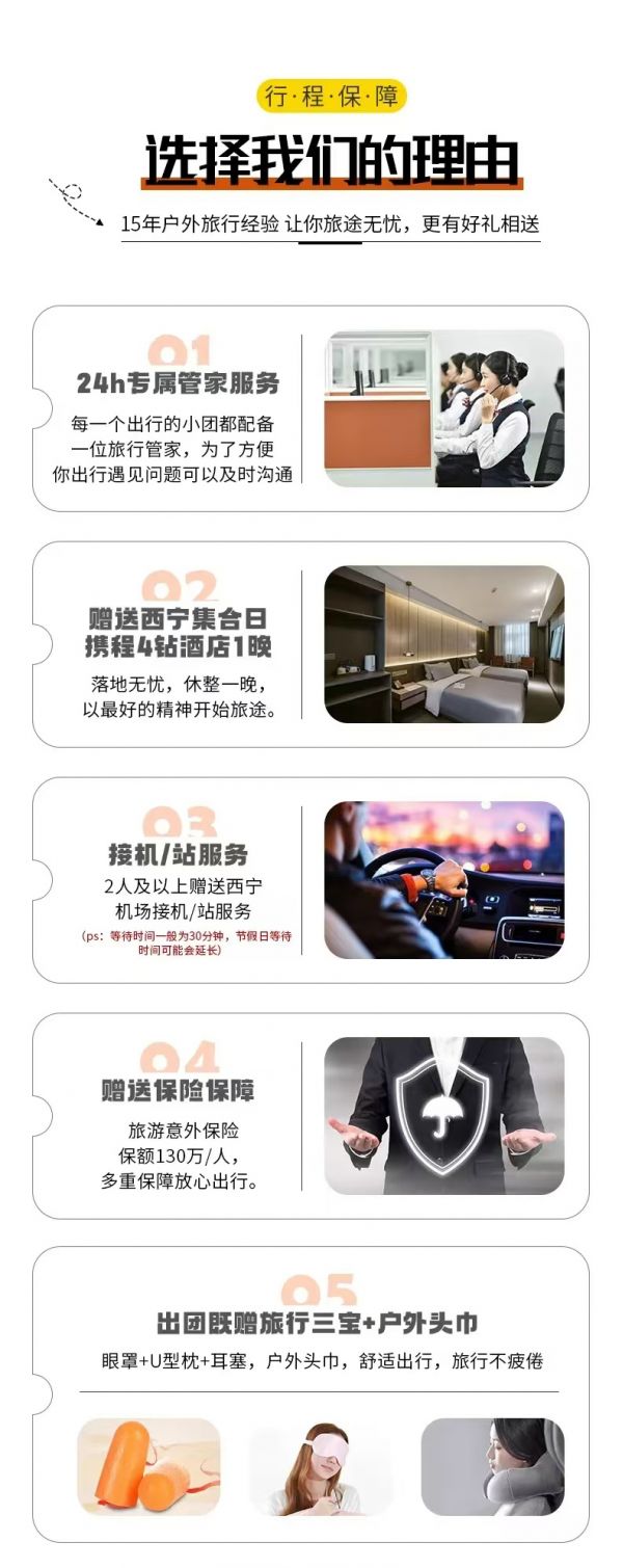 接機(jī)/站服務(wù):本次活動(dòng)提供西寧市內(nèi)24小時(shí)接機(jī)/接站服務(wù),工作人員會(huì)在您出發(fā)日期前一天21:30之前向您推送消息并與您聯(lián)系,如果超過時(shí)間沒有接到任何通知,請(qǐng)及時(shí)與報(bào)名處聯(lián)系。(接站等待時(shí)間一般為15-20分鐘,最長不超30分鐘,節(jié)假日拼單人數(shù)較多情況下客人等待時(shí)間可能會(huì)延長)。