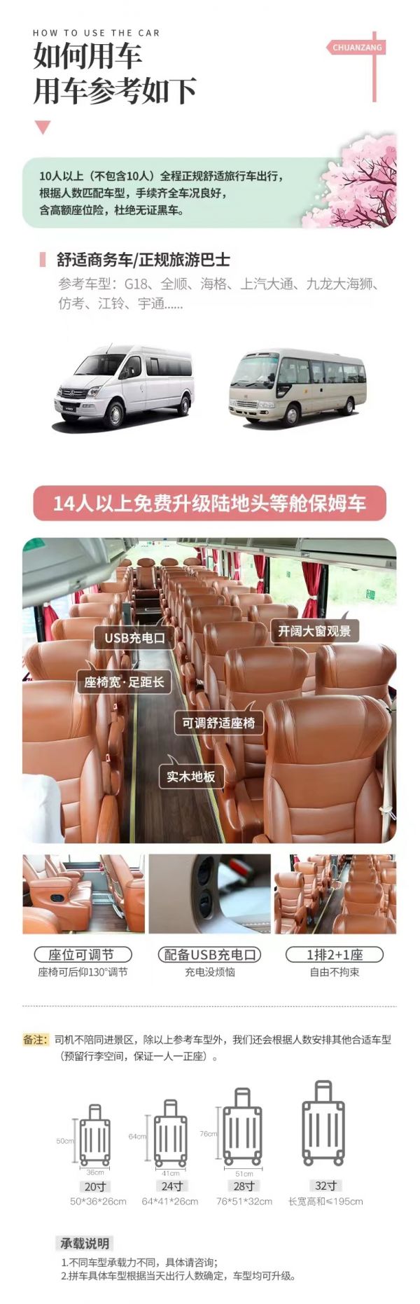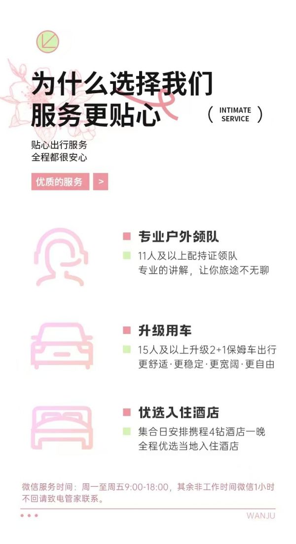 用車:15人及以上立即升級(jí)保姆車出行;為保證成團(tuán)及質(zhì)量,根據(jù)人數(shù)派不同座位數(shù)用車,保證每人一正座;包含司機(jī)一名、油費(fèi)、:過路費(fèi)、停車費(fèi),包含從出發(fā)地到景點(diǎn)及酒店費(fèi)用,不包含晚間自由活動(dòng)交通;