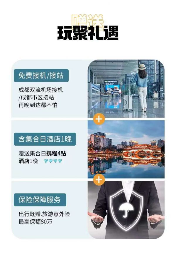 返回成都統(tǒng)一散團(由車上游客協(xié)商一致送至統(tǒng)一散團點,若協(xié)商不成則由司機送至三環(huán)內(nèi)就近地鐵站散團),結束本次愉快的旅行。由于川西地區(qū)路況復雜,有可能因為堵車而發(fā)生延誤,請大家盡量預定第二天返程的航班或車次。