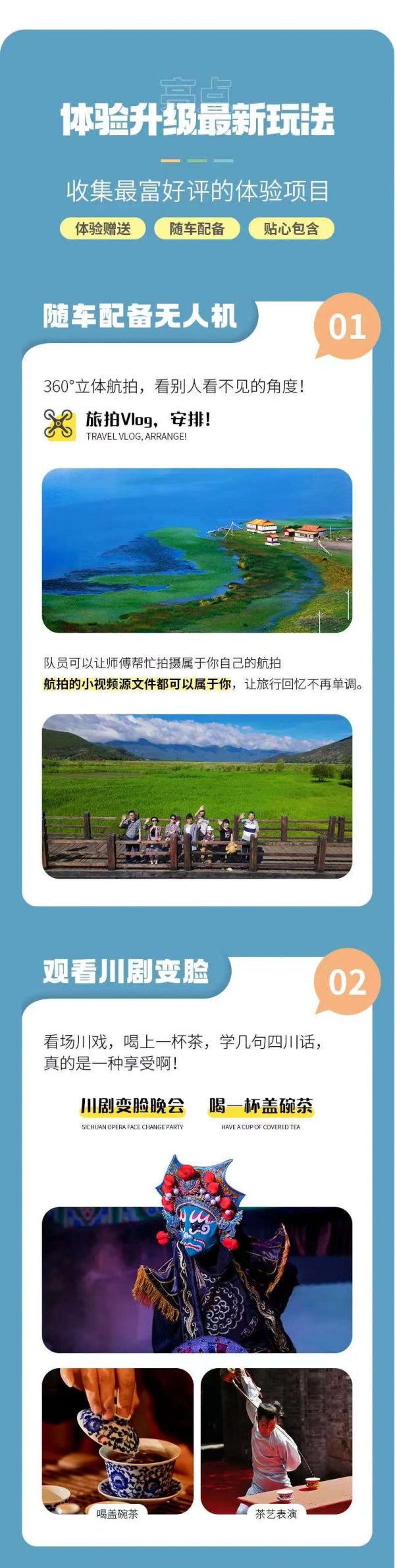 后前往打卡【IFS 太古里】,【大慈寺】自由活動,來到成都最潮的地方春熙路&太古里,這里有數(shù)不清的帥哥美女,有爆紅的網(wǎng)紅打卡地,有美味的成都美食。伴著新年的熱情,春熙路&太古里見證了成都這座包容城市的萬紫千紅。后觀賞國粹經(jīng)典【川劇變臉晚會】(費用已包含,贈送項目,不去不退費),觀看時間約 60 分鐘。看場川戲,喝上一杯茶,學幾句四川話,真的是一種享受啊。演出很精彩,各種雜技絕技:變臉、噴火、頂燈、都有了,劇情完整,高潮跌宕,舞臺效果唯美,非常值得一看。后乘車到玉林小酒館打卡拍照(約 30 分鐘),如須用餐或長時間停留可直接散團,后自行返回酒店。