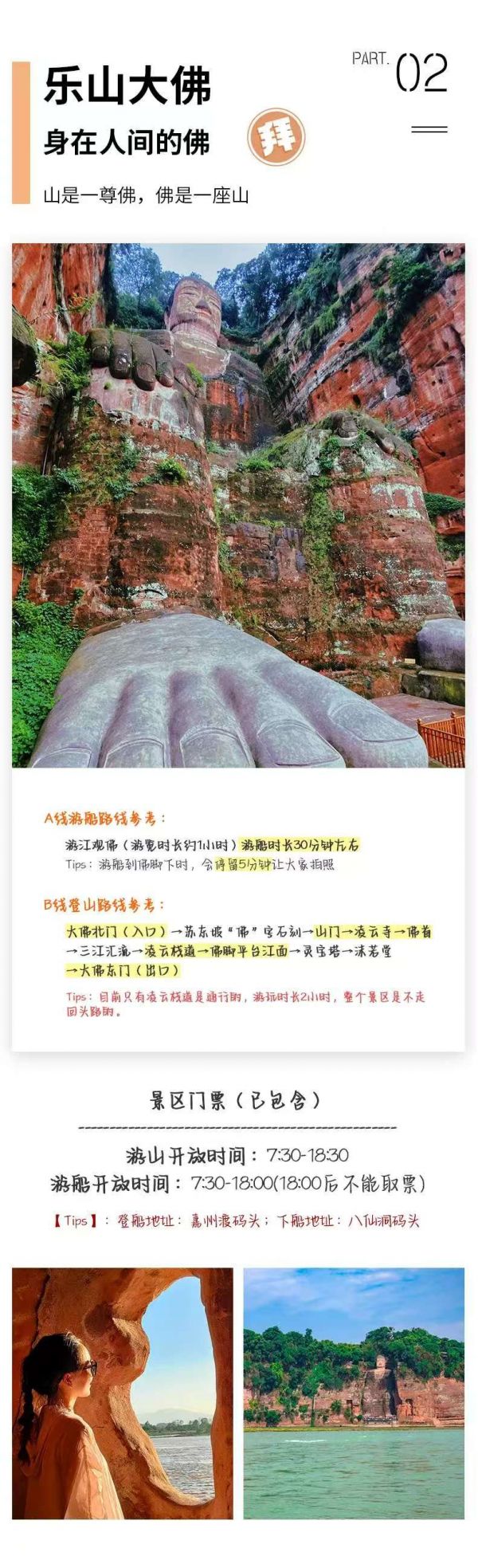 午餐后乘車前往【樂山大佛】景區(qū),(門票已含,游覽約 1.5-2 小時)。觀賞世界第一大彌勒坐佛--樂山大佛、凌云寺、九曲摘道、大雄寶殿、靈寶塔,在瞻仰樂山大佛宏偉氣勢的同時,體驗”蜀道難、難于上青天的感覺”,抱千年佛腳后,游漫山的石刻佛像。