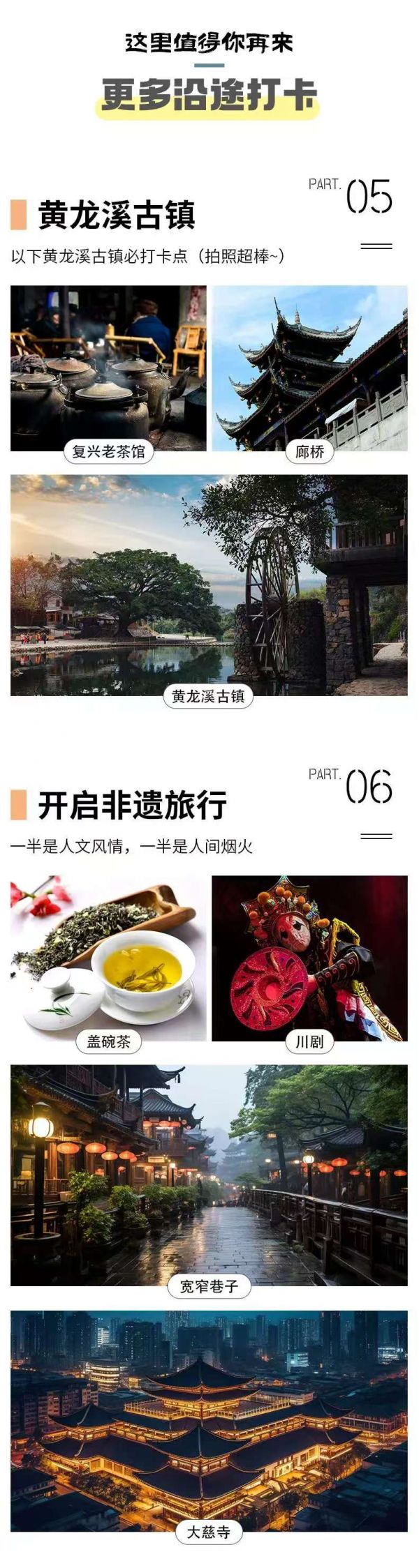 如果時間充裕,您【成都特色美食】有火鍋、缽缽雞、糖油果子、鐘水餃、龍抄手、紅糖鍋盔、還有各類“蒼蠅館子”,五花八門,色味俱佳,來之前一定要做足功課!成都飲食偏麻、辣,一定注意不要暴飲暴食、吃太辣致腸胃不適。