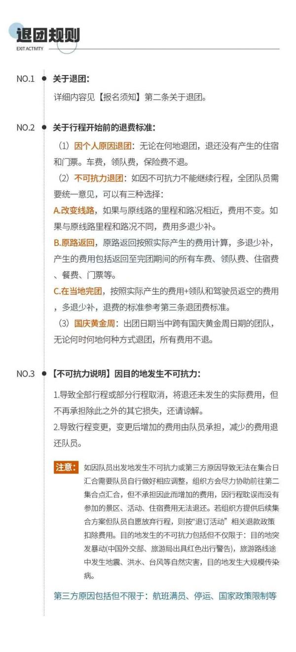 不可抗力:因不可抗力因素造成團隊行程更改、延誤、滯留或提前結束時,旅行社可根據(jù)當時的情況全權處理,如產(chǎn)生費用增減,按未發(fā)生費用退還游客,超支費用由游客承擔的辦法處理。