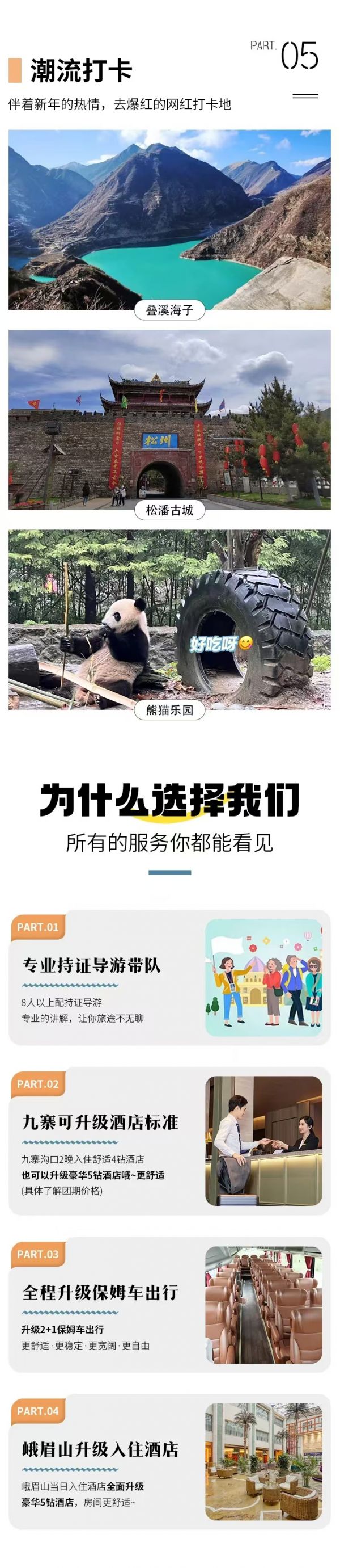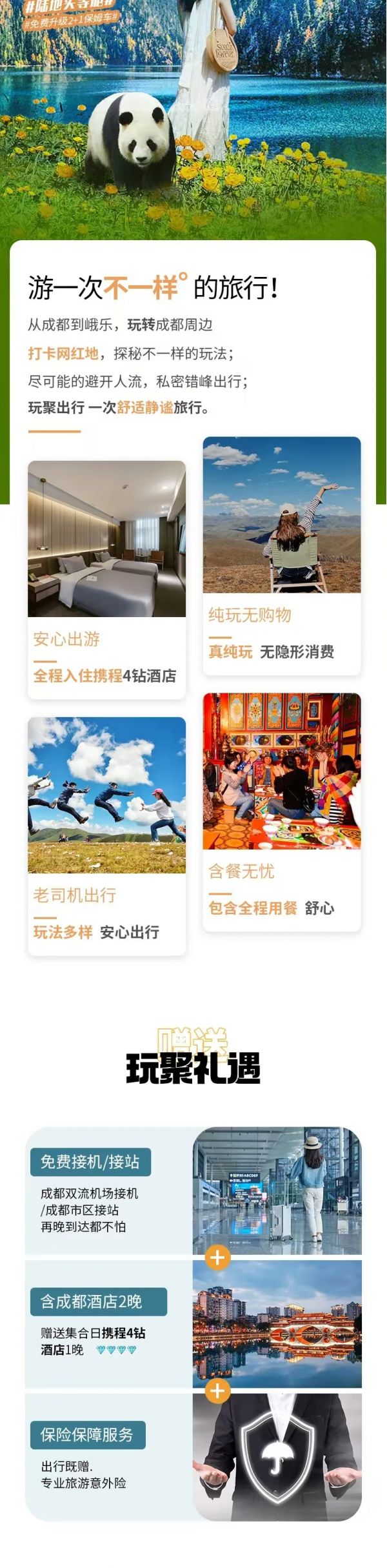 贈送:九寨溝景區(qū)旅拍2張精修+底片全送(電子版)、峨眉山溫泉體驗、川劇變臉表演晚會、專業(yè)旅游意外險(不含財產險)、2人以上24H成都雙流機場接機/成都市區(qū)車站接站
