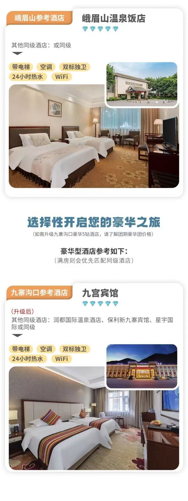 住宿:全程5晚住宿(含集合日贈送1晚4鉆酒店、不住不退不換不指定)九寨溝口的酒店分為4鉆和5鉆兩種類型,具體了解團期價格。