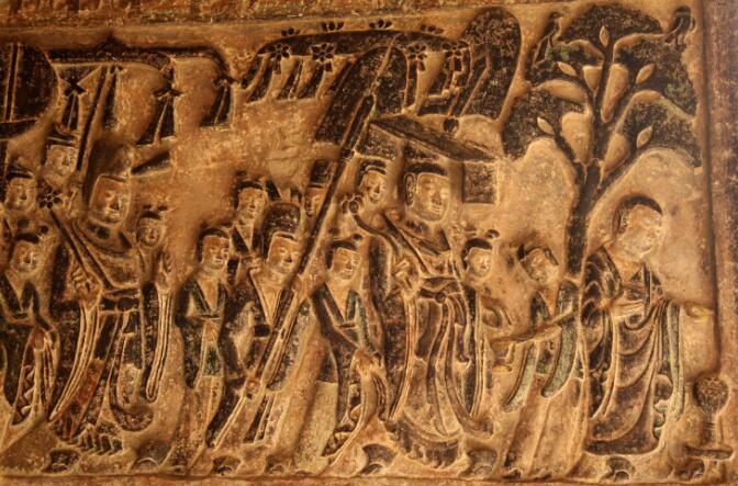 參觀結束后赴鞏義石窟,石窟諸佛造像多為方圓臉型,神態(tài)文雅恬靜,衣紋簡練。禮佛圖、飛天、神獸、佛教故事等是現(xiàn)存較完整的北魏浮雕造像。其中最精美的為第一窟“帝后禮佛圖”,構圖分三層,東邊是以皇帝為首的男供養(yǎng)為前導, 畫面中儀態(tài)雍雅的貴族和身體矮小的待從形成了尊卑鮮明的對照。第四窟的“帝后禮佛圖” 人物造型獨具匠心,前呼后擁的禮佛儀仗隊中供養(yǎng)人大腹便便,相貌森嚴,侍從瘦小低微,比主像小三分之一。儀仗隊中有的為帝后攜提衣裙,有的執(zhí)扇撐傘,有的手捧祭器,浩浩蕩蕩地簇擁帝后進香禮佛,表現(xiàn)了皇室宗教活動的盛大場面。構圖簡練生動,刻工細膩,為我國石窟浮雕藝術中罕見的杰作。途中用中餐。