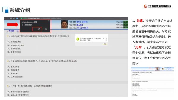 考試過程中系統(tǒng)會(huì)調(diào)用選手電腦或手機(jī)攝像頭,進(jìn)入考試時(shí)請點(diǎn)擊“允許”,考試結(jié)束后系統(tǒng)將不會(huì)繼續(xù)監(jiān)控。