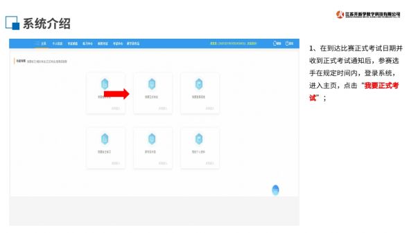 4.到理論考試日期并收到通知后,參賽選手在規(guī)定時(shí)間內(nèi)登陸系統(tǒng)-進(jìn)入主頁-點(diǎn)擊“我要正式考試”-選擇要參與的考試名稱-點(diǎn)擊“進(jìn)入考場”并確認(rèn)考試。