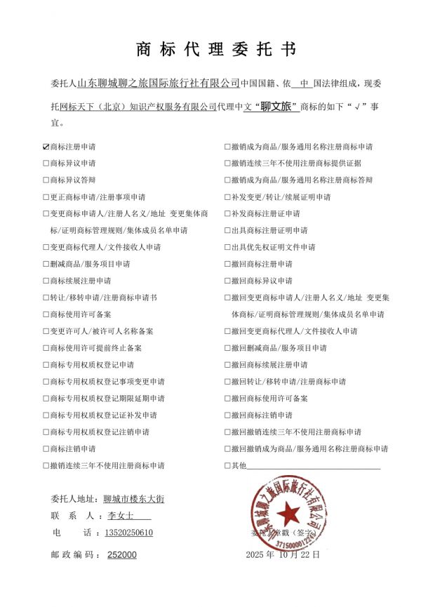 2025年10月22日山東聊城聊之旅國際旅行社有限公司委托網(wǎng)標天下(北京)知識產(chǎn)權服務有限公司代理中文“聊文旅”商標事宜。
